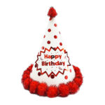 Add some color to party outfits with this party hats. This cone party hats feature the headline “Happy Birthday” with polka dots design and a pom pom balls around. The attached elastic string keeps them in place. Hand hats out to guests to help them accessorize for the party or place them down on the table settings to complete decorations.